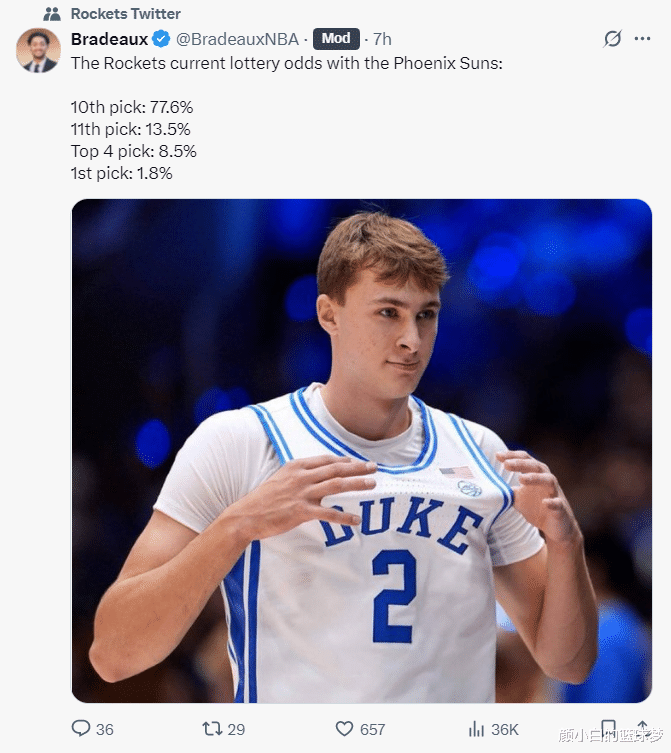 休媒Bradeaux晒出太阳2025年选秀权的概率:第十顺位77.6%,第11顺位13.5%,前四选秀8.5%,状元签概率1.8%。