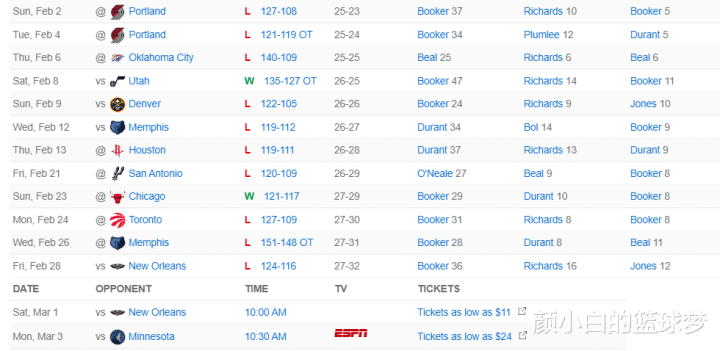凤凰城过去的12场比赛输掉了其中的10场,他们目前还是排在西部第11,他们与第十的国王之间已经拉开3.5个胜场,最恐怖的是杜兰特+布克两人合砍64分就连西部倒数第一的鹈鹕都无法击败。