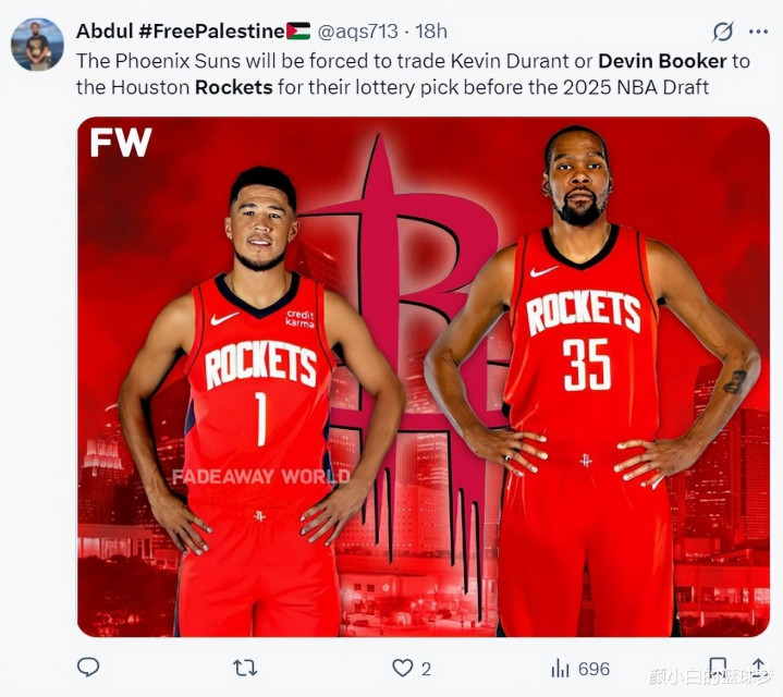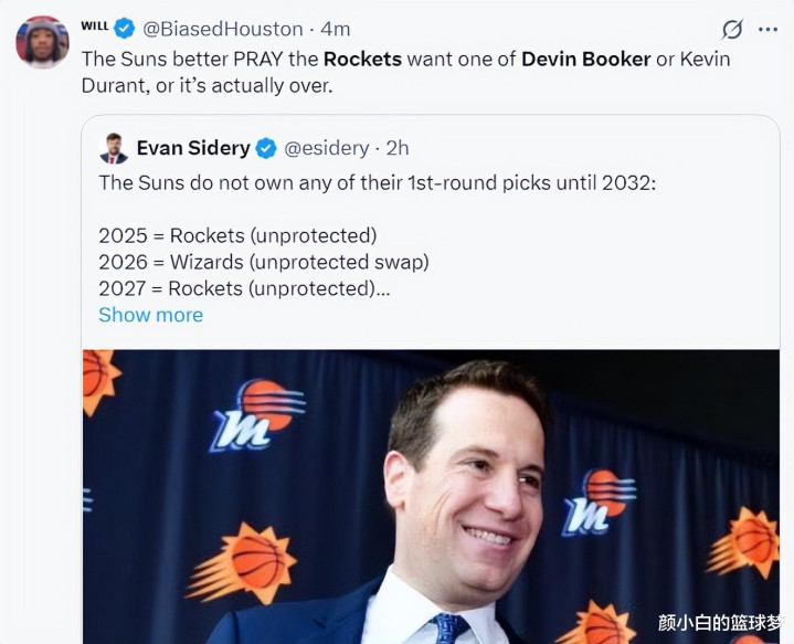 休媒:太阳队应该祈祷火箭队依旧有意他们的德文-布克。(火箭队今夏可以选一下布克还是杜兰特?)