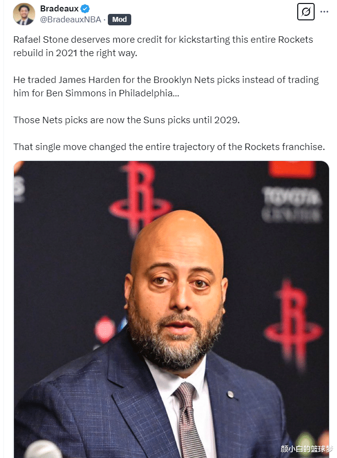 休媒盛赞拉斐尔-斯通——他以正确的方式在2021年启动火箭的重建,他用哈登交易了篮网的选秀权而不是去费城换西蒙斯,这些篮网的选秀权现在变成太阳的选秀权与互换权直到2029年,这一举动改变了火箭的整个轨迹。