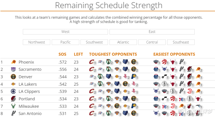 太阳余下的23场比赛对手平均胜率高达57.2%,太阳要挤进附加赛都已经成为奢求。